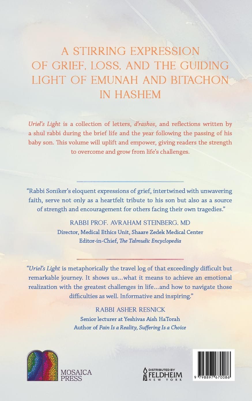 Uriel’s Light is a collection of letters, d’rashos, and reflections written by a shul rabbi during the brief life and the year following the passing of his baby son. This volume will uplift and empower, giving readers the strength to overcome and grow from life’s challenges.